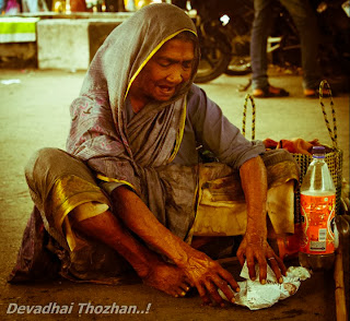 ‘நண்பர்போன் பண்ணார், யாருக்காவது ஒரு சாப்பாடு வாங்கிகுடுக்கச் சொன்னார், அதான் கோயிலுக்கு எதித்தாப்பலஒரு அம்மா இருந்திச்சி. அதுகிட்டகொடுத்து வந்தேன். ஆனா என்ன வேடிக்கைன்னாஅது பிச்சகாரி மாதிரியே தெரியல, ஹின்டு படிக்குது‘